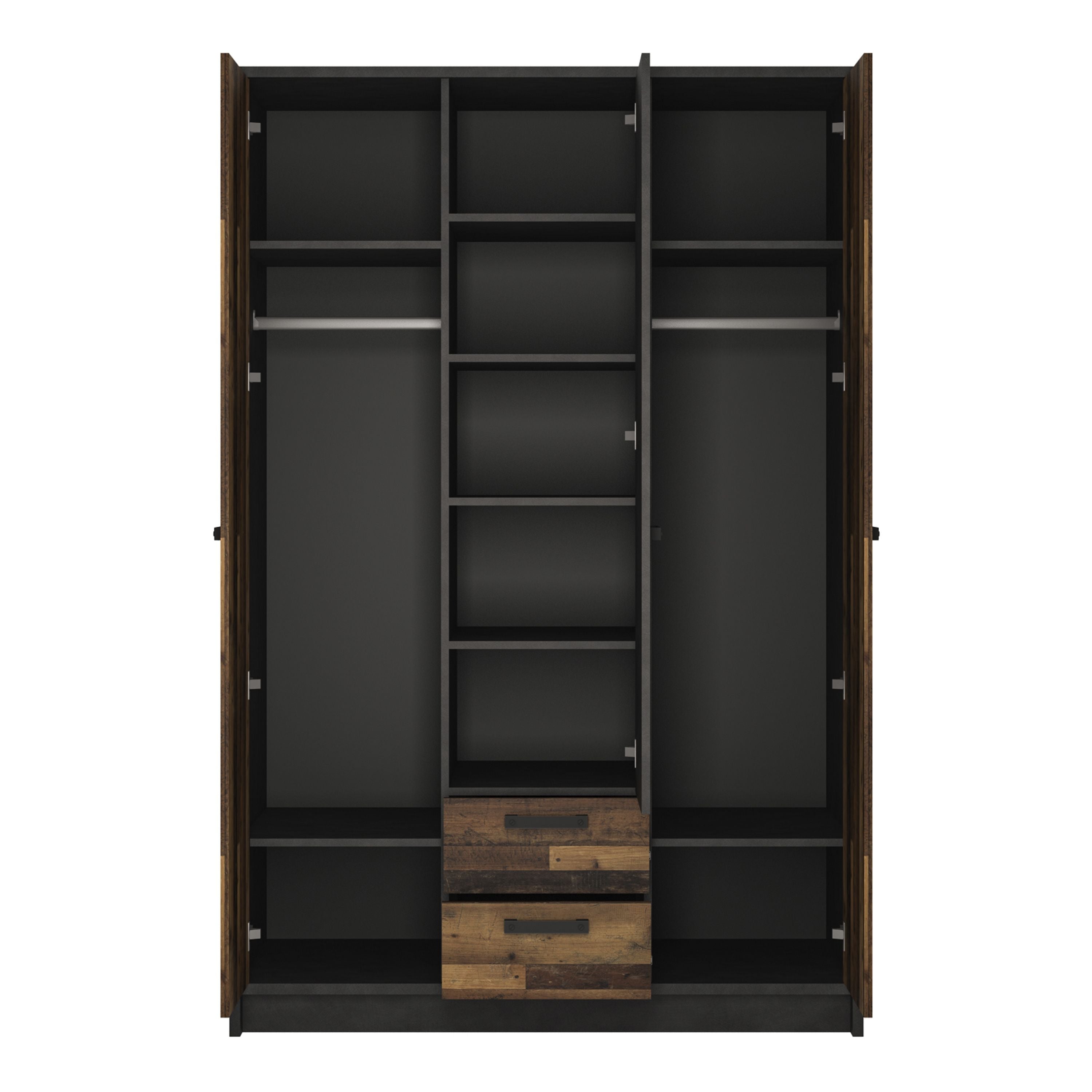 The Brooklyn 3 Door Wardrobe in walnut and dark Matera grey offers a stylish blend of modern industrial design and rustic charm. Crafted for durability, it features a scratch-resistant surface, ensuring it stays looking pristine over time. This wardrobe provides generous storage, making it perfect for both master bedrooms and children’s rooms.